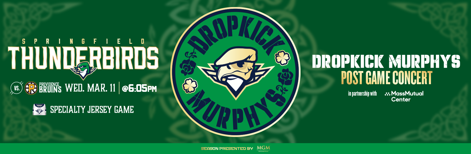 Get ready, Springfield — the Dropkick Murphys are shipping up to the MassMutual Center! The legendary Massachusetts band will take the stage for a special postgame concert right after the Springfield Thunderbirds face off against the Providence Bruins on Wednesday, March 11, 2026. Puck drops at 6:05 p.m., and the show kicks off about 30 minutes after the final horn inside the MassMutual Center Exhibition Hall.