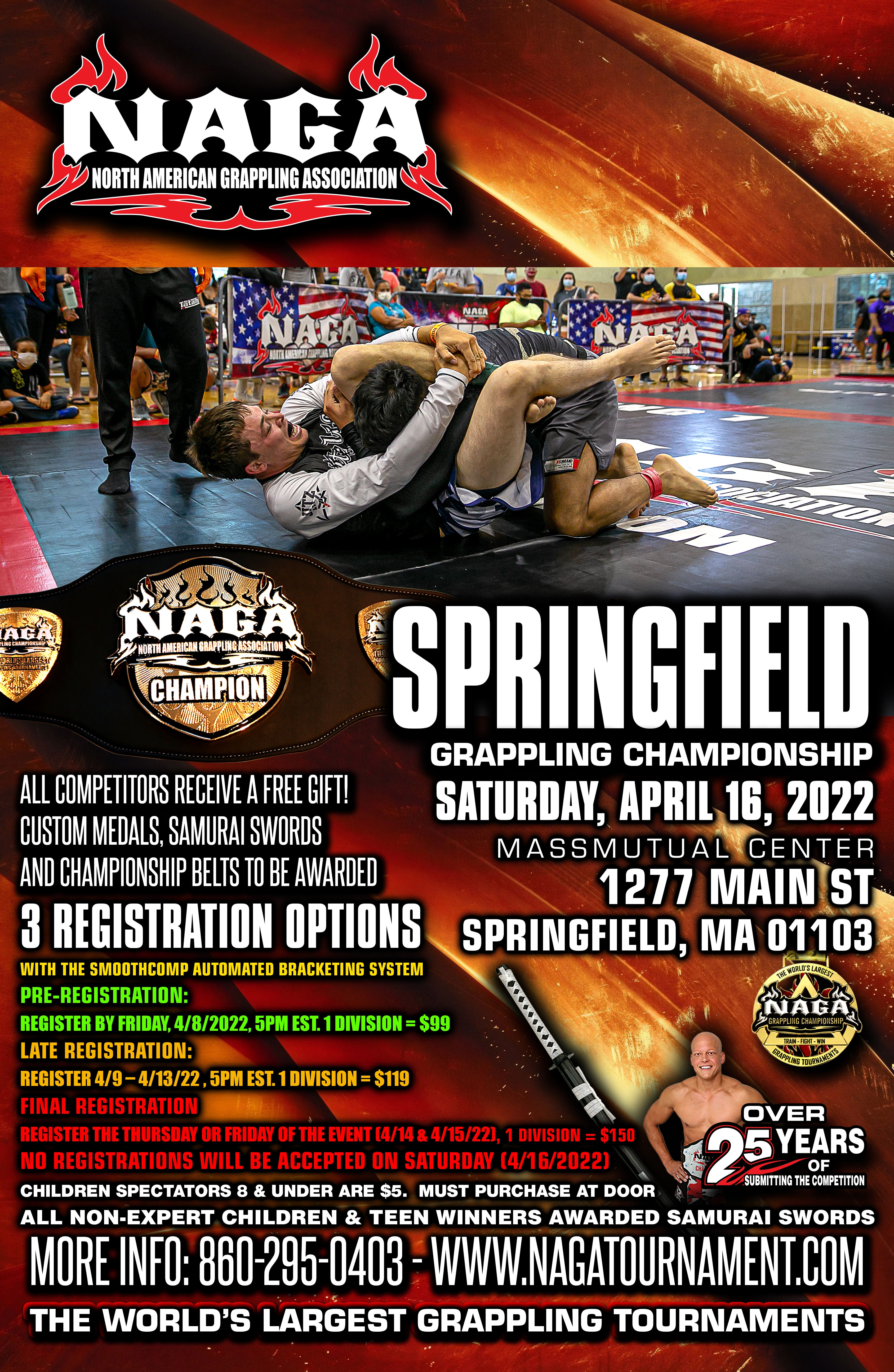 The North American Grappling Association (NAGA) is the world’s largest mixed grappling tournament circuit with over 750,000 competitors worldwide. On Saturday, April 16, 2022, NAGA returns to Springfield, MA. Children and Teens will compete first and then be followed by the Adult divisions. Come as an individual or as a team to compete in this no-gi & gi event.
