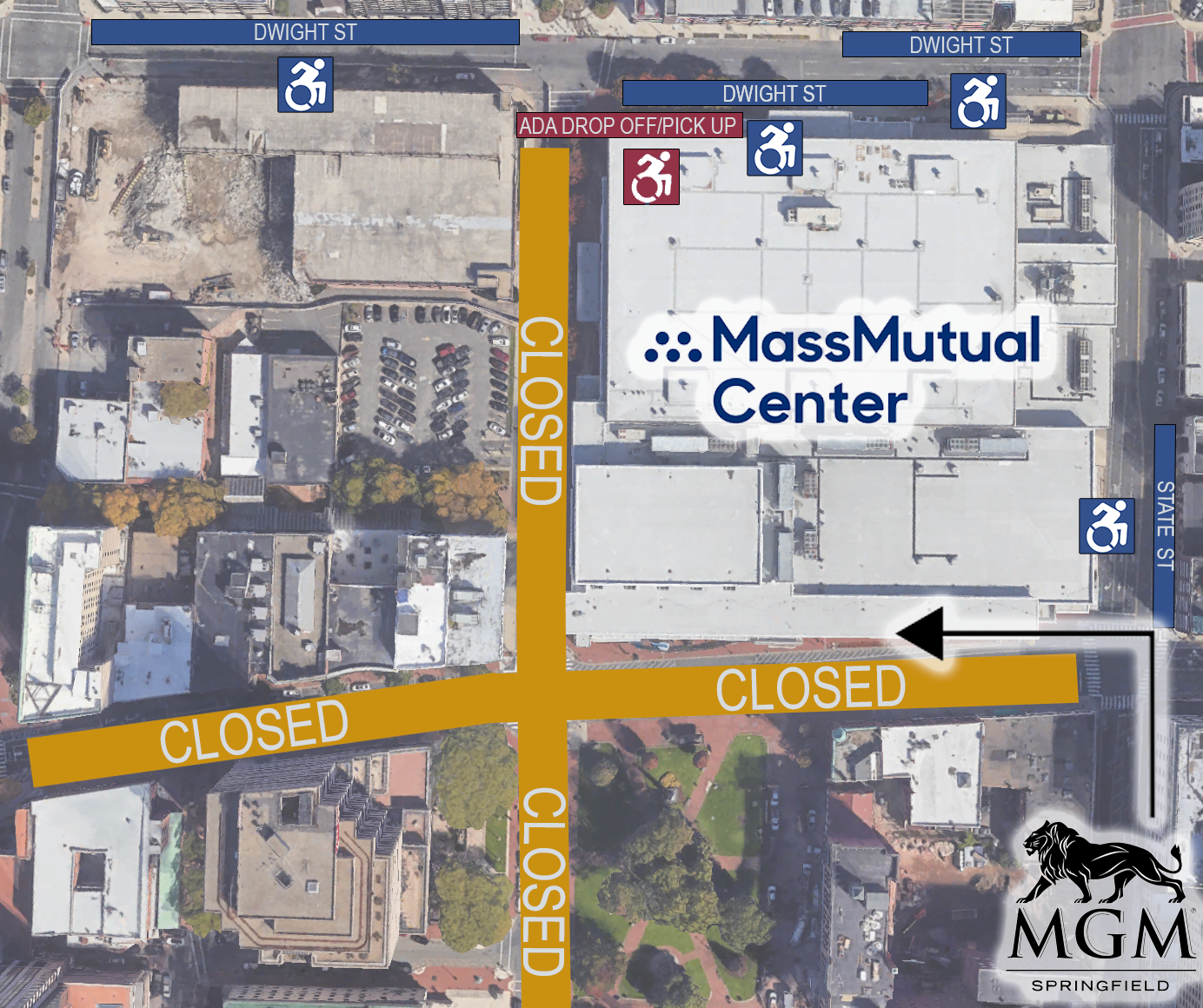 - Guests will enter the MassMutual Center at the Main entrance on Bruce Landon Way.